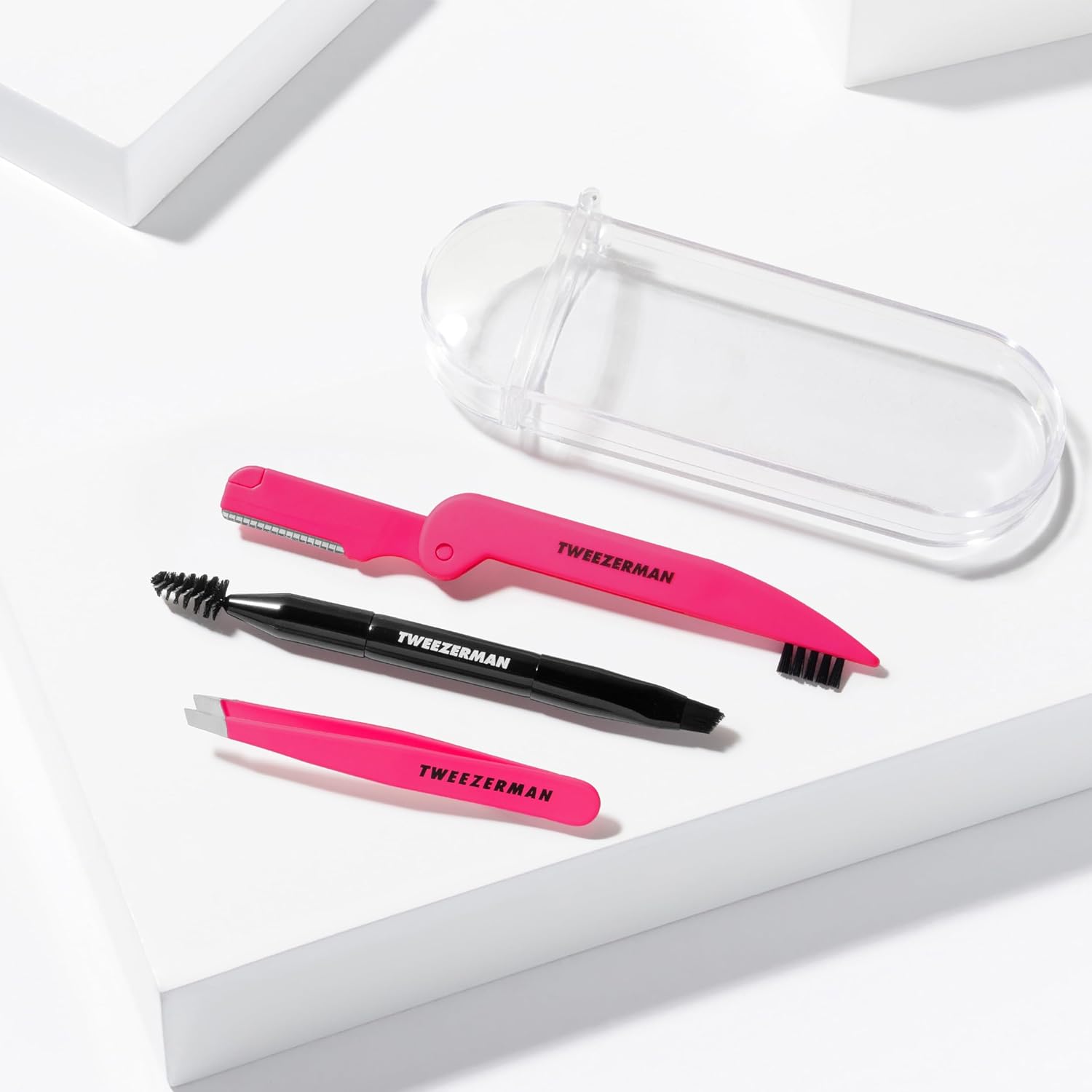 Tweezerman's Mini Brow Rescue Kit features precision tools for expert brow shaping. Featuring our best-selling Mini Slant Tweezer, Folding Razor, and Mini Angled Brow Brush in a clear, portable case, great for travel or touch-ups on-the-go.